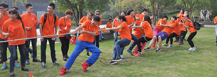 這天,陽光明媚,草坪被擠得水泄不通。公司的運動員們個個躍躍欲試,信心十足,我們先是擺好了姿勢,成“工”字步式,用腳頂著腳,勾住腳:身子往后傾,雙手像鐵鉗似的,用手抓住大繩。比賽開始,王博裁判員一聲令下,參賽隊員們手拉著手,腳頂著腳,使出渾身力氣,奮力地拔著。繩子中的紅布條一會向左,一會向右,好像兩只鴨子搶吃一只蚯蚓似的。比賽異常焦灼,市場部獲得了本次比賽的勝利,果然姜還是老的辣,勝利的歡呼聲響徹了草坪的上空。