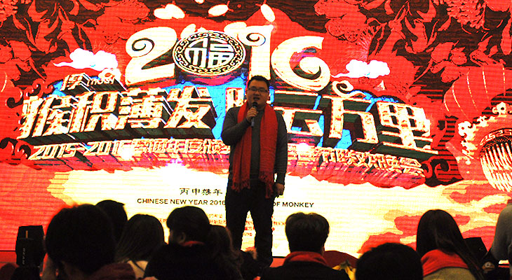 年會開始了,我們時(shí)間是這樣安排的,早上是部門經(jīng)理的演講,下午是年會表演,晚上進(jìn)行頒獎(jiǎng),是按這樣的流程走的。大會的主持人是技術(shù)部的阿杜。