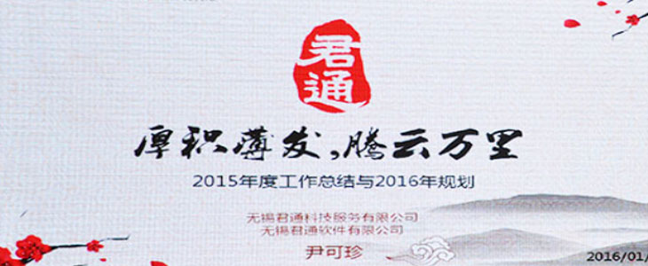 時光荏苒,轉眼間難忘的2015年已經過去,充滿期待的2016年向我們走來。新的一年,帶來新的目標和希望。 回望過去的2015年,仔細觀察君通這個大家庭中可愛的人們,這注定又是一條百味雜陳的心靈之旅。歲月無痕,對于君通人走過的路程、取得的成績進行梳理時,無論是震撼還是感動,無論是歡笑還是淚水,在這一刻,已經漸漸顯示出它超越時間的力量。回首往昔,我們碩果累累,君通人在大家長尹總的帶領下,用誠信維護客戶的利益,用執著應對市場浪潮的沖擊,打造了我們良好的市場口碑和君通品牌,我們相信:君通15年的品牌是我們過去大的成;堅定現在,我們激情澎湃,有著眾多的市場精英,的技術團隊,貼心的客戶服務,再輔以良好的行政管理,我們相信:硬件設施齊全、軟件功能強大,我們離終的夢想一定會越來越近!;展望未來,我們信心滿懷,有著尹總的領航,有著眾多君通人的助槳,我們的航船必將乘風破浪,再創佳績!