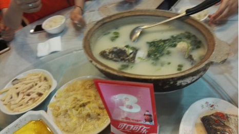 在品味過天目湖的白茶后,大家都已經(jīng)是饑腸轆轆,來到飯店后,我們終于嘗到了傳說中的魚頭湯,湯的味道不同于普通的魚湯,味道鮮美而且能感覺到自然的味道,在魚頭湯的面前,其他的菜都已經(jīng)黯然失色,沒過多久湯被大家分光了。