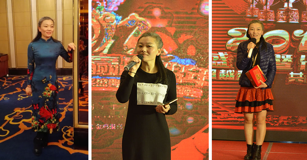 壓軸戲,我們的旗袍秀,秀出了君通娘子軍的風范。看仙仙的儉妹妹,秀氣的小任,活潑的小朋友,大氣的張經理,君通的姿深美女代表王姐,一件旗袍,展現了她們的妖嬈,和秀美。哇!我們的女王出場了,章會計挽著尹總的手,緩緩的向臺前走來,揮手間,君通當家人博愛和大氣展現盡致!大家掌聲歡呼聲久久!看著尹總慈愛的揮手,好想送一束漂亮的花給你!