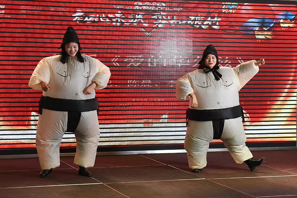 一直是小品擔(dān)當(dāng)?shù)募夹g(shù)部的同事們?nèi)珕T出動先后給大家送上小品《同學(xué)聚會》、《開年會》、《B超風(fēng)云》、《安檢》,別看他們工作中一絲不茍、兢兢業(yè)業(yè)的模樣,幽默詼諧起來的表演令人捧腹不已。